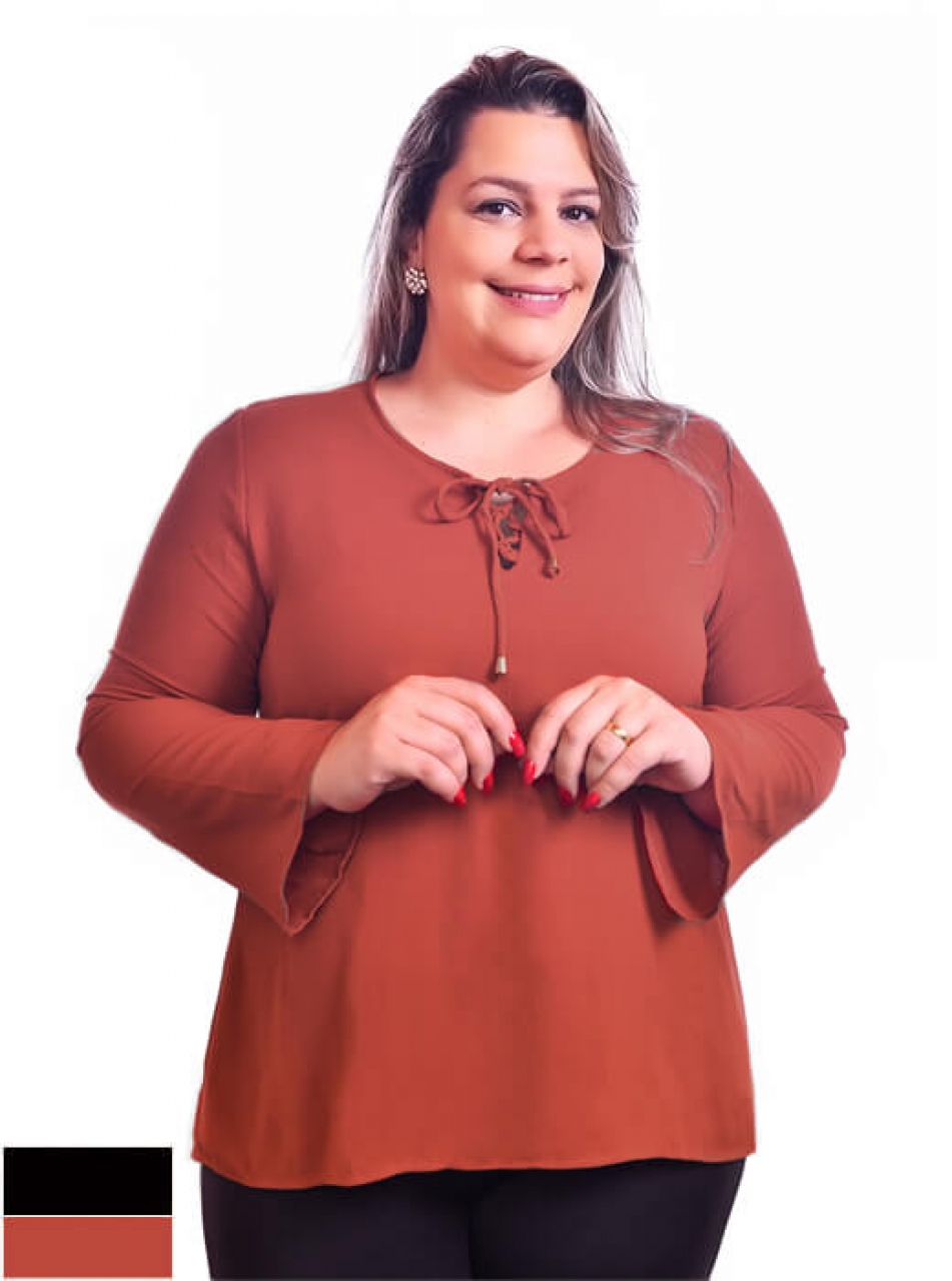 Carregando...Bata Feminina Plus Size, em crepe, ampla, manga flare;