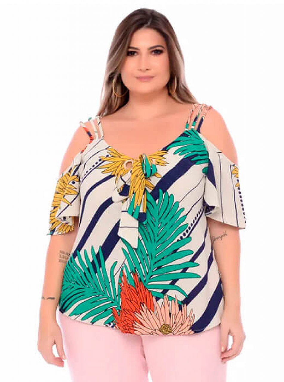 Carregando...Blusa Feminina Plus Size, em viscose, estampa floral, colorida, modelo ciganinha;
