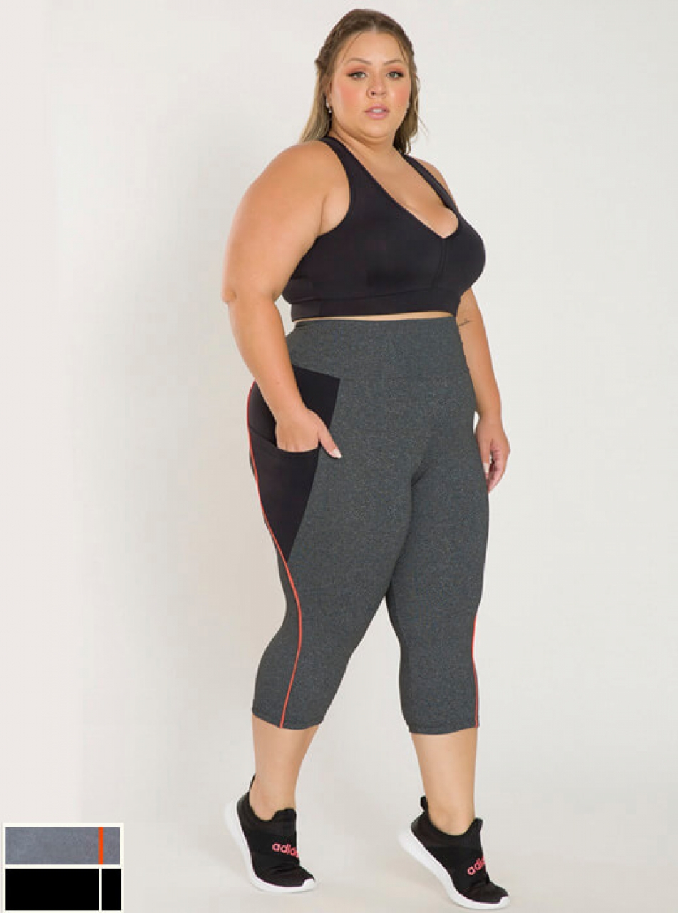 Carregando...Calça Feminina Plus Size, Corsário, em poliamida, com elastano, na cor cinza mescla, moda plus size fitness;