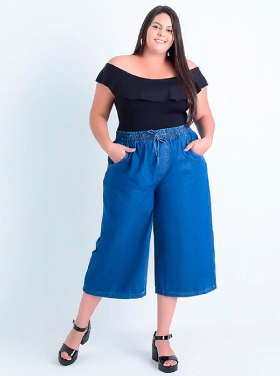 Carregando...Calça Plus Size Pantacourt, na cor azul jeans, lavagem média;