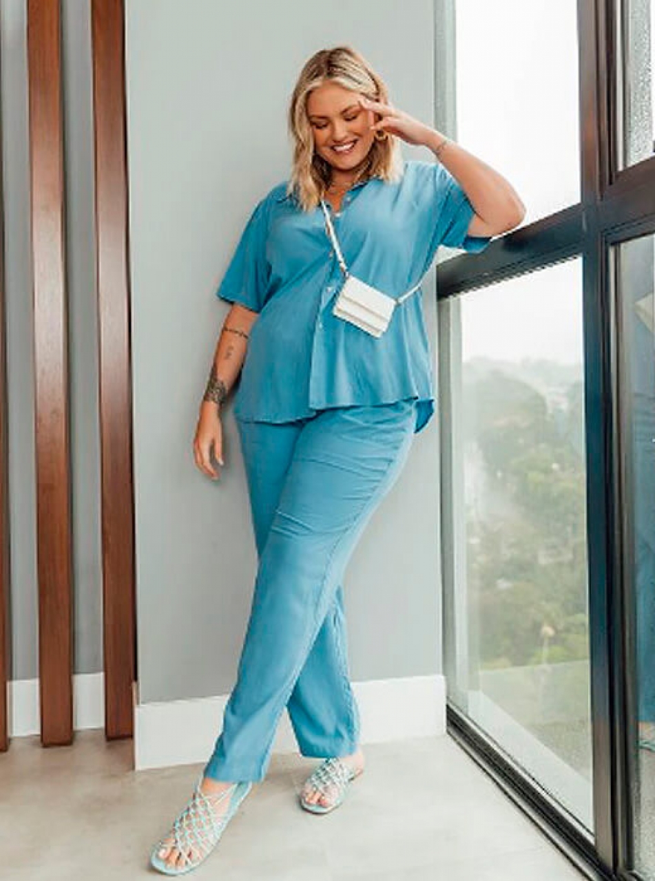Carregando...Camisa Feminina Plus Size, em viscose de qualidade premium, na cor azul claro;