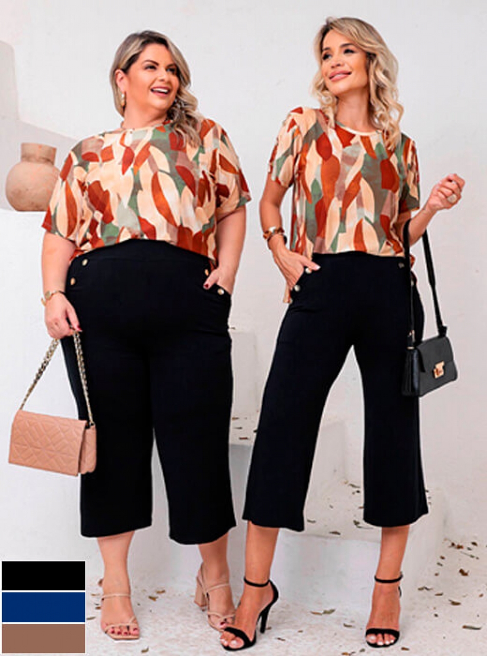 Carregando...Conjunto Feminino Plus Size em viscolycra - viscose e elastano, composto por blusa ampla e calça pantacourt;