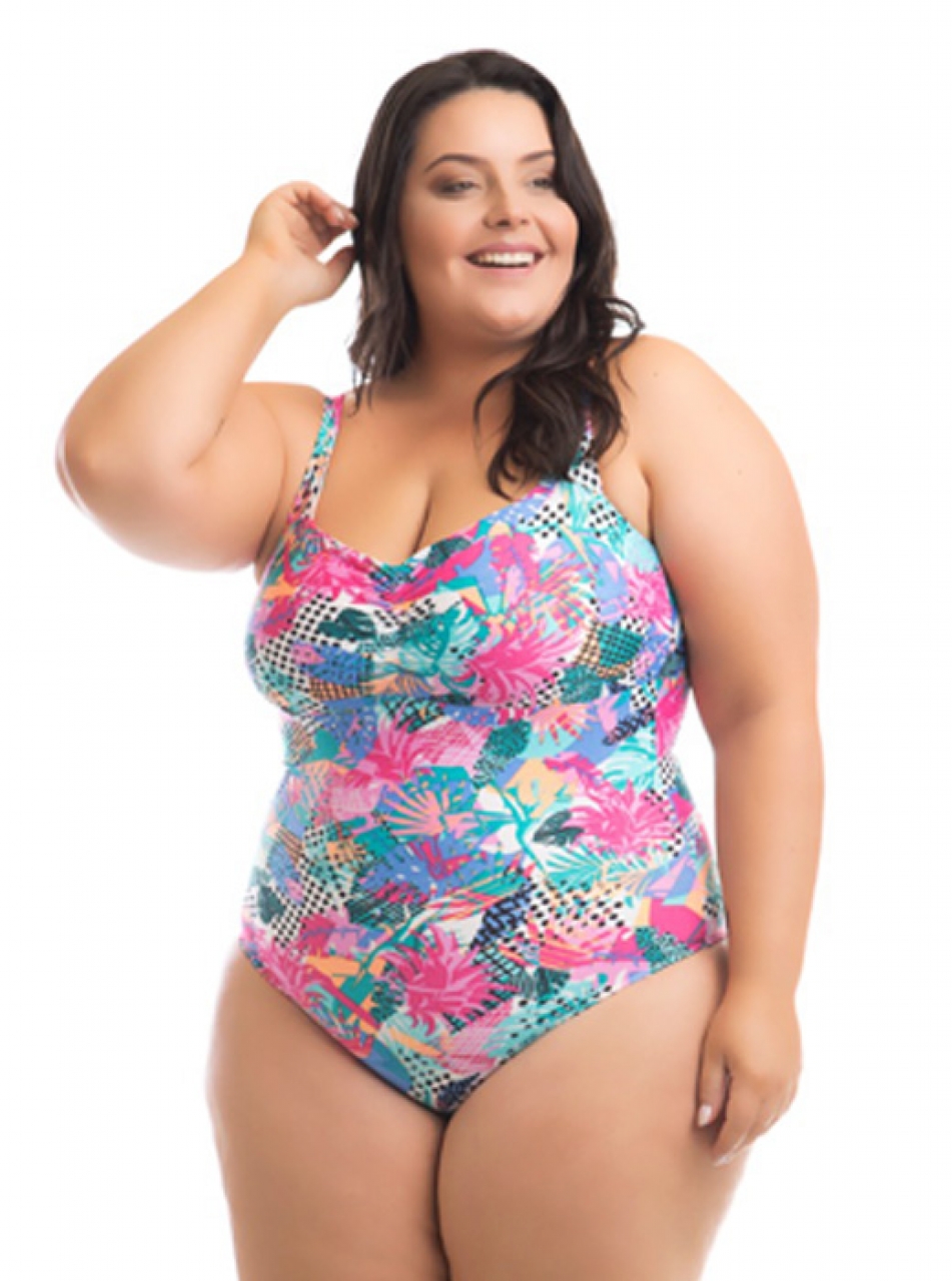 Carregando...Maiô Plus Size, confeccionado em Lycra, estampa tropical, com forro, sem bojo e sem aro;