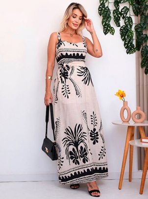 Vestido Longo Plus Size Estampado Nude e Preto