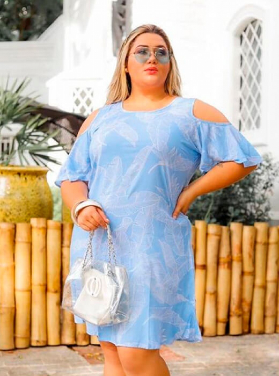 Carregando...Vestido Plus Size em viscose, estampado, modelo ciganinha;