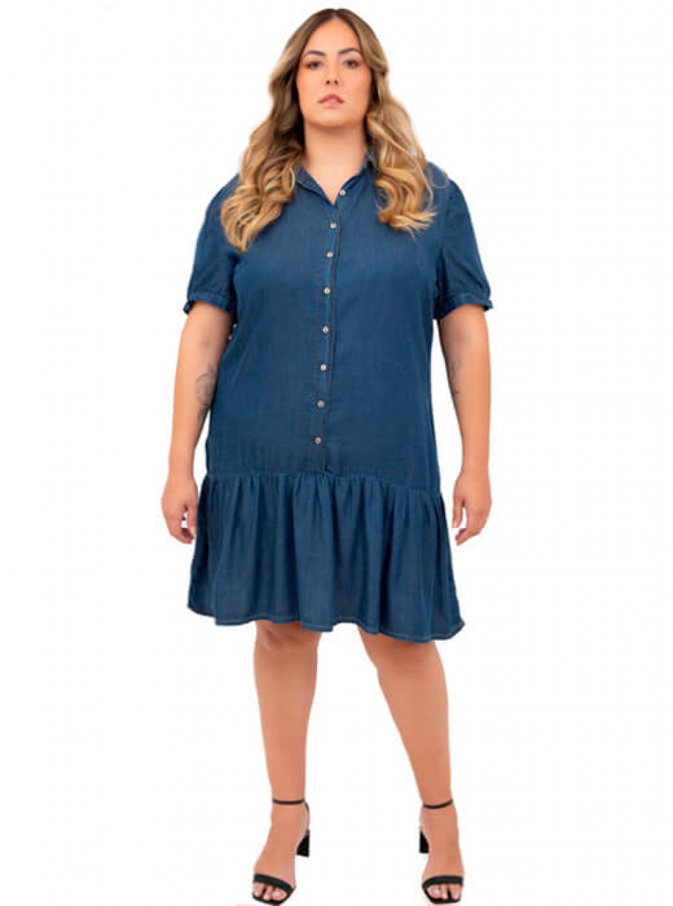 Carregando...Vestido Plus Size, confeccionado em tecido, plano, jeans, liocel, modelo curto;